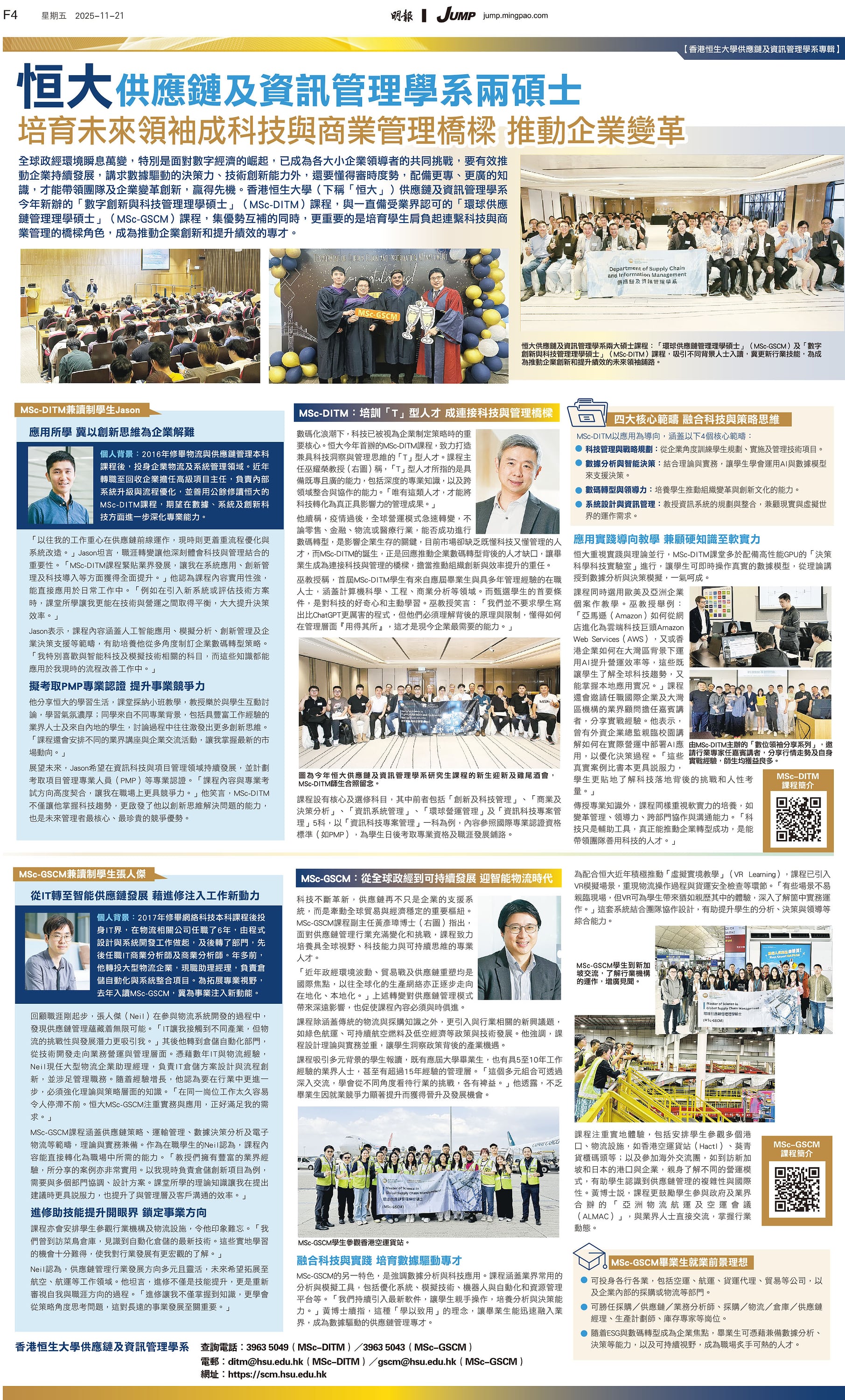 2025年11月21日,《明報》JUMP教育就業版刊登兩篇專題,聚焦供應鏈及資訊管理學系的碩士及學士課程,分別為: