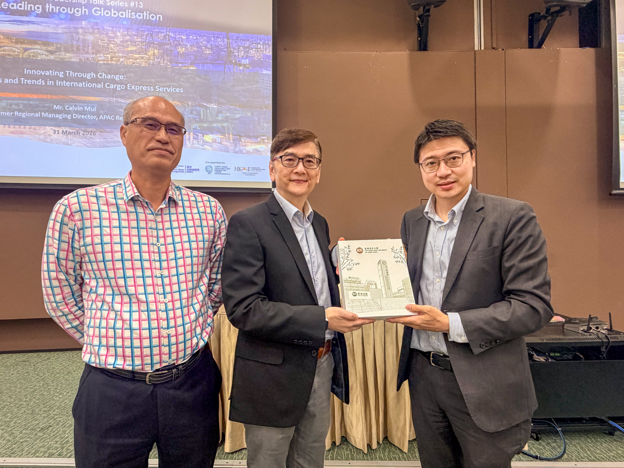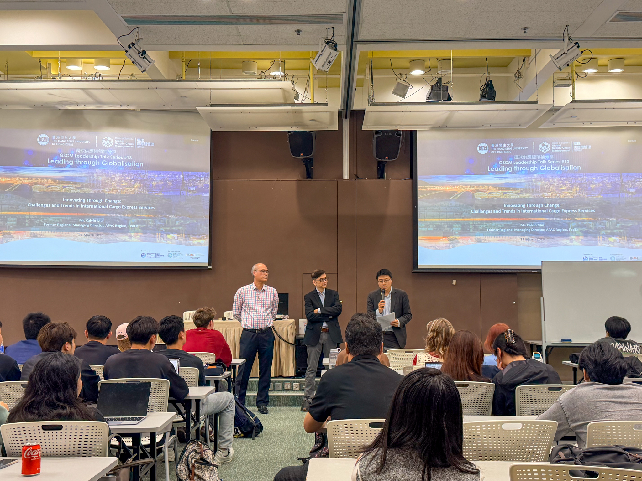 “GSCM Leadership Talk #13 – Leading through Globalisation: Innovating Through Change: Challenges and Trends in International Cargo Express Services” organized by the Master of Science in Global Supply Chain Management Programme (MSc-GSCM), The Hang Seng University of Hong Kong (HSUHK), co-organized by Supply Chain Excellence and Innovation Centre (SEIC), and Hong Kong Institute of Engineers (HKIE) – Logistics and Transport Division, was held on 31 March 2026 (Tuesday) at the Tsimshatsui Kaifong Association Academic Hall, HSUHK Campus.