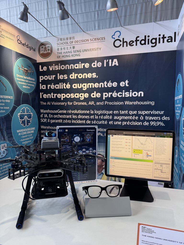The Hang Seng University of Hong Kong (HSUHK)’s School of Decision Sciences and Chef Digital Limited have developed “WarehouseGenie”, Hong Kong’s first real-time smart warehouse system integrating artificial intelligence (AI), drones, and augmented reality (AR). The innovation won the Gold Medal with Jury Congratulations at the International Exhibition of Inventions Geneva 2026 on 14 March. The system leverages advanced technologies—including generative AI (GenAI), drones, AR, and the Internet of Things (IoT)—to address key challenges in the warehousing sector, such as high staff turnover, complex standard operating procedures, and rising demands for safety and accuracy.